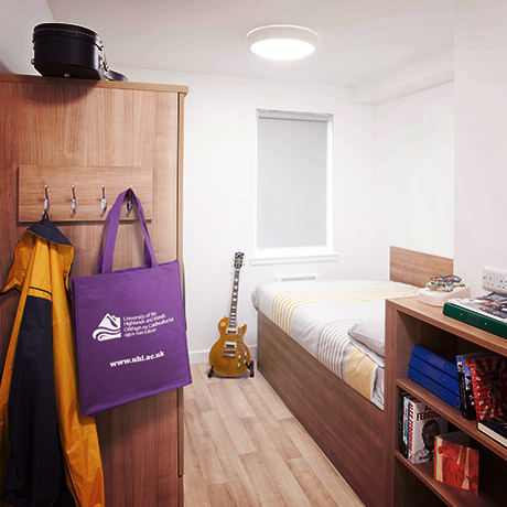 UHI Inverness Shared kitchen spaceBathroomUHI Inverness Single room accommodationInverness College UHI Accommodation BuildingsBed area of roomBed and desk area of roomShared kitchen areaShared living room areaEn suite bathroom