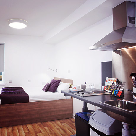 Our modern studio rooms all include en suite facilities, as well as a spacious wardrobe, comfortable study area and convenient storage. You will have your own cooking facilities within the room.