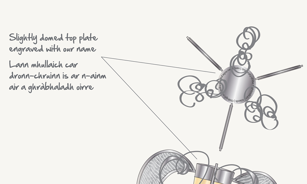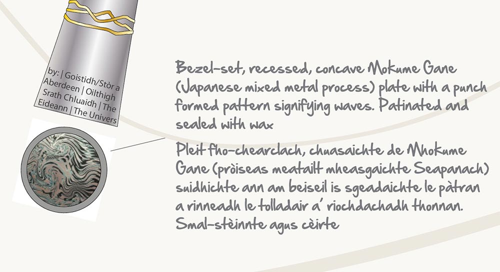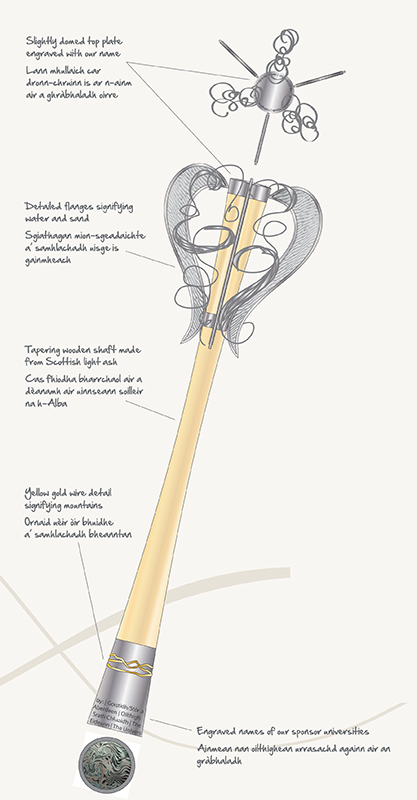 Lann mhullaich car dronn-chruinn is ar n-ainm air a ghràbhaladh oirreSgiathagan mion-sgeadaichte a’ samhlachadh uisge is gainmheachCas fhiodha bharrchaol air a dèanamh air uinnseann soilleir na h-AlbaOrnaid uèir òir bhuidhe a’ samhlachadh bheanntan`Ainmean nan oilthighean urrasachd againn air an gràbhaladhPleit fho-chearclach, chuasaichte de Mhokume Gane (pròiseas meatailt mheasgaichte Seapanach) suidhichte ann am beiseil is sgeadaichte le pàtran a rinneadh le tolladair a’ riochdachadh thonnan. Smal-stèinnte agus cèirte.Neach-giùlain a’ Chuaille-shuaicheantaisCuaille-suaicheantais