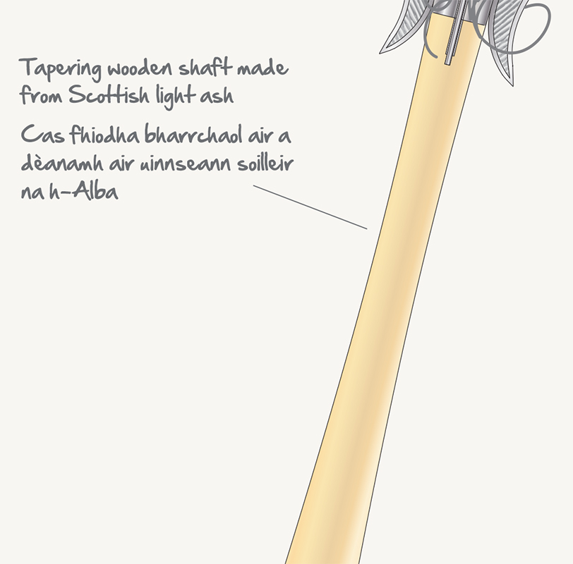 Tha an cuaille-suaicheantais air a dhèanamh air airgead is fiodh – le uinnseann soilleir dùthchasach na h-Alba airson na coise – agus beagan òir is mheatailtean co-mheasgaichte sa mhion-sgeadachadh. Tha an t-ornachadh a’ samhlachadh gainmheach no tràighean, uisge agus adhar, agus am bonn sgeadaichte le trì uèirean de dh’òr buidhe 18ct a tha a’ dealbhadh bheanntan. Tha lann chuasach an grèim aig fìor bhonn a’ chuaille, mar shamhla air uisge is tonnan.