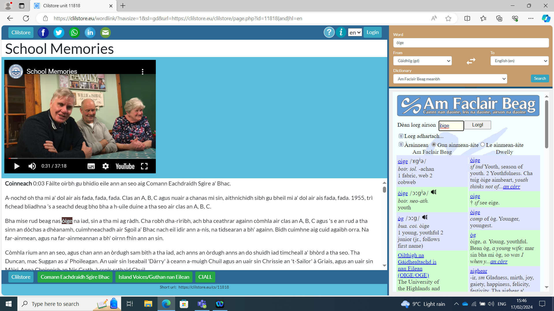 A' leantail air an obair a chaidh a dhèanamh o chionn treiseag leis a’ Chomann Eachdraidh gus fo-thiotalan a chur air cuid dhe na bhidiothan Gàidhlig aca, tha muinntir an LSI ag obair a-nis air duilleagan-lìn a chruthachadh a bheir cuideachadh leis a’ bhriathrachas, a’ cur còmhla an dà chuid bhidio agus tar-sgrìobhadh. Faodar am bhidio fhaicinn fhad ‘s a thathas a’ leughadh an teacsa, agus faodar stad a chur air a’ bhidio ma nochdas facal air nach eil an neach-leughaidh eòlach, gus a lorg ann am faclair le aon chliog a-mhàin. Mar eisimpleir, seo “School Memories” à Sgoil a’ Bhac, le Coinneach MacÌomhair ann an còmhradh leis na seann charaidean-sgoile aige.